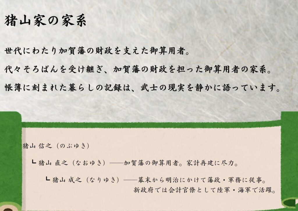 猪山家は代々、藩の財政を預かる“御算用者”として、そろばんを使い収支を管理していた家柄です。