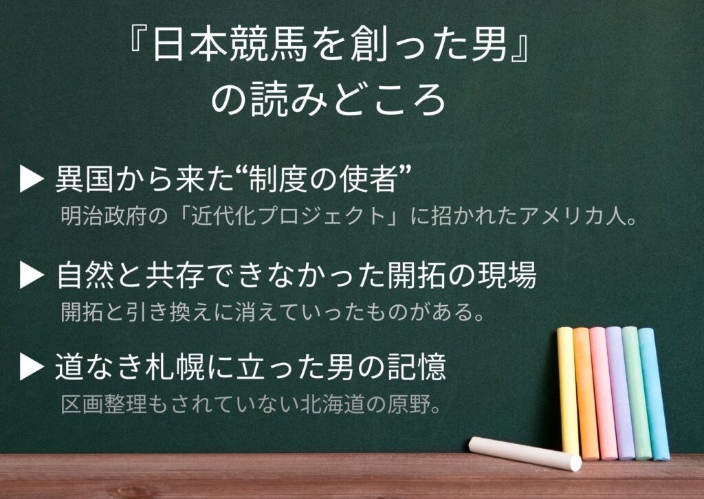 彼は、ただ馬を育てるだけでなく、競馬のしくみそのものを日本に伝えます。